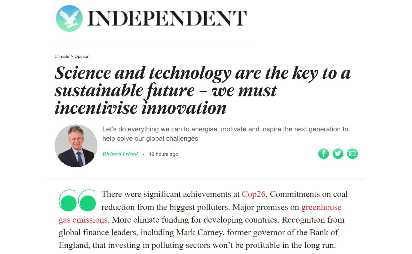 Bài viết của GS Richard Friend được đăng tải tại chuyên mục Góc nhìn của tờ báo nổi tiếng có hàng chục triệu độc giả trên khắp thế giới với tiêu đề “Khoa học và Công nghệ là chìa khóa của một tương lai bền vững - chúng ta cần khuyến khích sự đổi mới”.