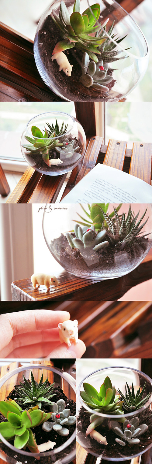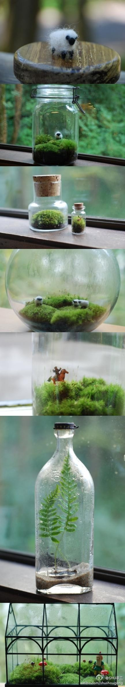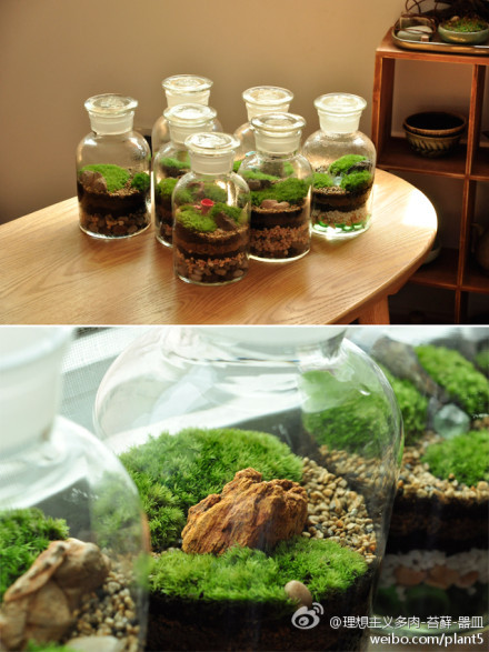 Cũng là cây cảnh nhưng những mảng xanh nhỏ nhắn trông thật xinh xắn và càng thêm lóng lánh, mát rượi trong những chiếc lọ thủy tinh trong vắt.