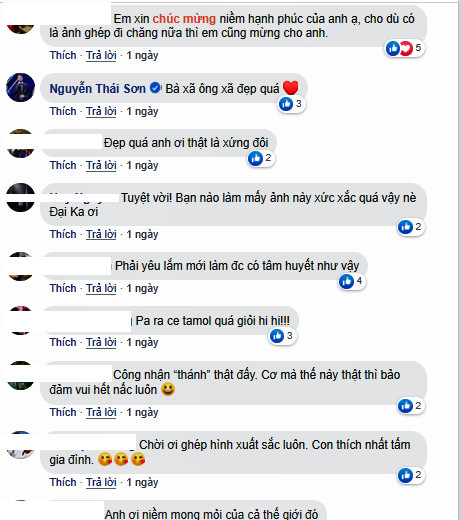 Những hình ảnh và chia sẻ của Mr Đàm nhanh chóng gây “bão” trên khắp các diễn đàn mạng xã hội, bên dưới phần bình luận, nhiều người hâm mộ thích thú viết: “Em xin chúc mừng niềm hạnh phúc của anh ạ, cho dù có là ảnh ghép đi chăng nữa thì em cũng mừng cho anh"; “Tuyệt vời! Bạn nào làm mấy ảnh này xuất sắc quá vậy nè Đại Ka ơi”; “Phải yêu lắm mới làm đc có tâm huyết như vậy”.