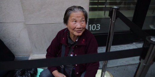 Người đầu tiên trong dòng người tại Apple Store ở SoHo, New York là một phụ nữ cao tuổi Trung Quốc.