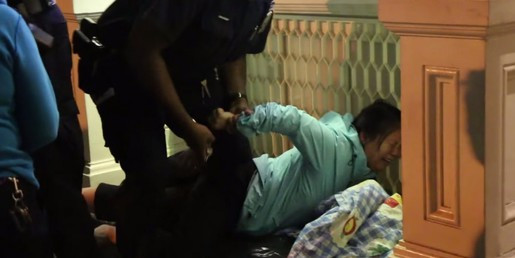 Không rõ lí do nào mà một phụ nữ Trung Quốc đã gào thét khi bị cảnh sát bắt giữ, buộc tra tay vào còng số 8 và đưa vào xe chở về trụ sở.