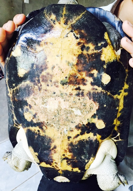 Theo bà Thu, xung quanh khu vực nhà bà chủ yếu là ao nuôi tôm nước mặn nên bà không biết con rùa từ đâu bò đến. Bà Thu cho biết, từ trước đến giờ bà chưa từng thấy con rùa nào to đến thế.