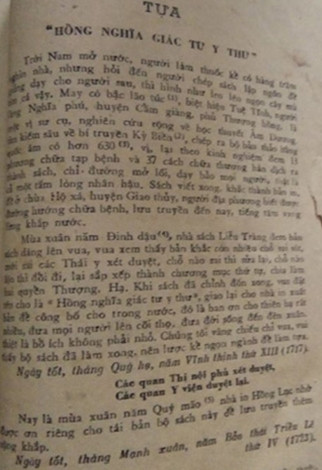 Cuối trang của cuốn sách là lời tựa Hồng Nghĩa Giác tư y thư. Cuốn sách này được làm bằng giấy đen, đã mất bìa và 40 trang đầu tiên của sách. Tuy đã cũ, nhiều trang giấy đã nát, mục, tuy nhiên chữ viết trong cuốn sách vẫn đọc khá rõ.Vì bị mất 40 trang đầu và phần phụ lục cuối nên không biết rõ cuốn sách được in năm nào và do nhà xuất bản nào ấn hành...