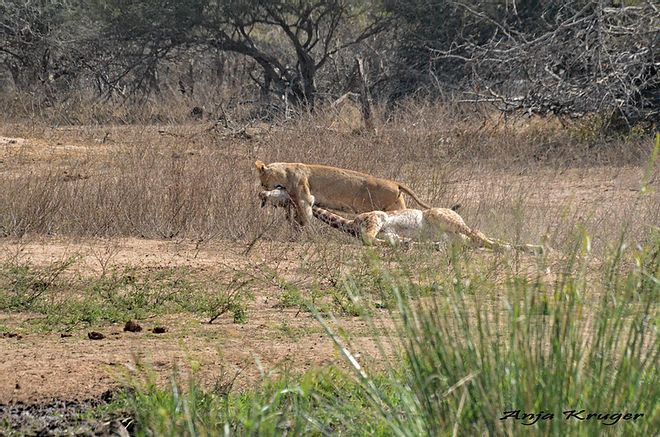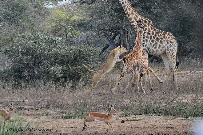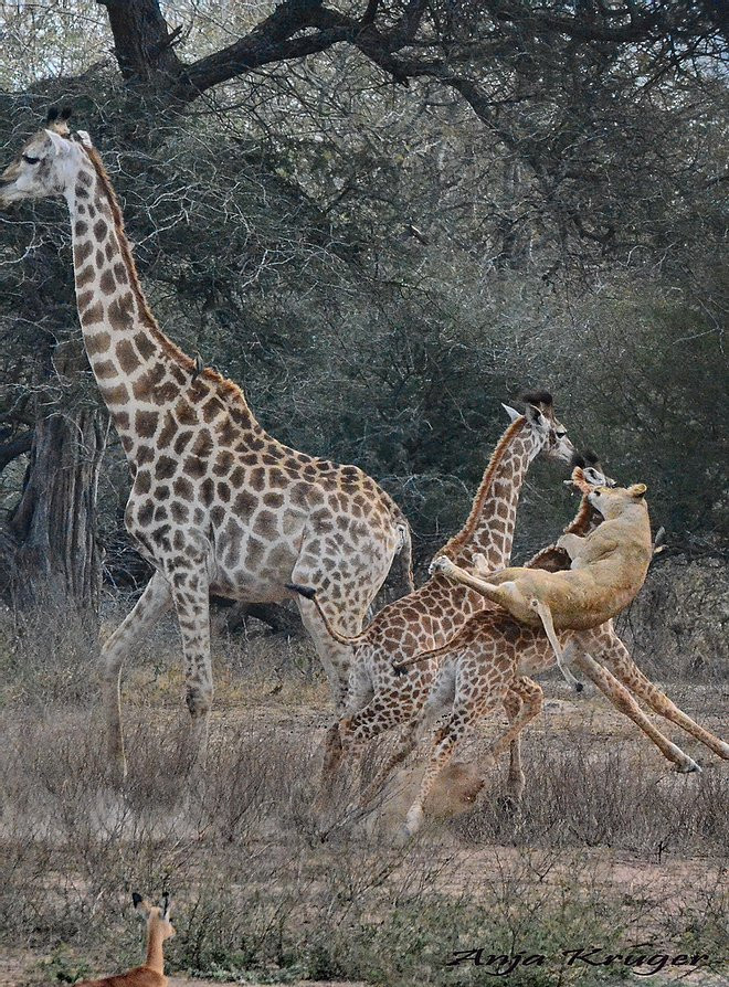 Cú nhảy cực nhanh của con sư tử đã giúp nó dễ dàng cắn vào cổ một chú hươu cao cổ con.