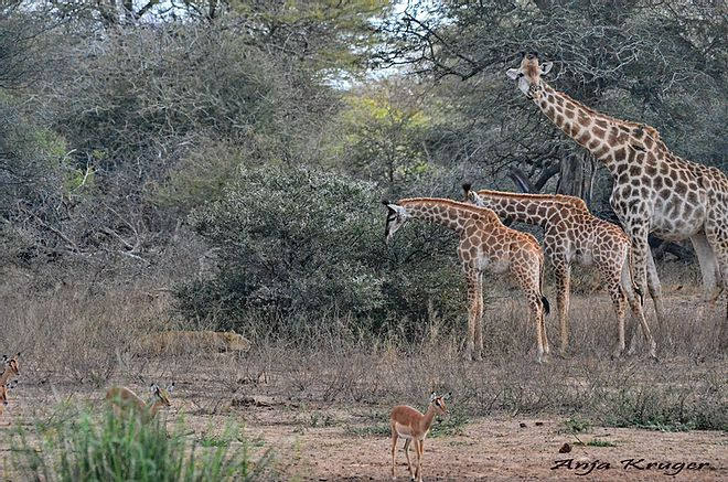 Trong lúc đi kiếm ăn, 3 mẹ con hươu cao cổ đã có cuộc chạm trán không mong muốn với con sư tử. Thế nhưng, thay vì trốn chạy thì chúng lại cố gắng cúi đầu xuống coi cho kỹ kẻ săn mồi.