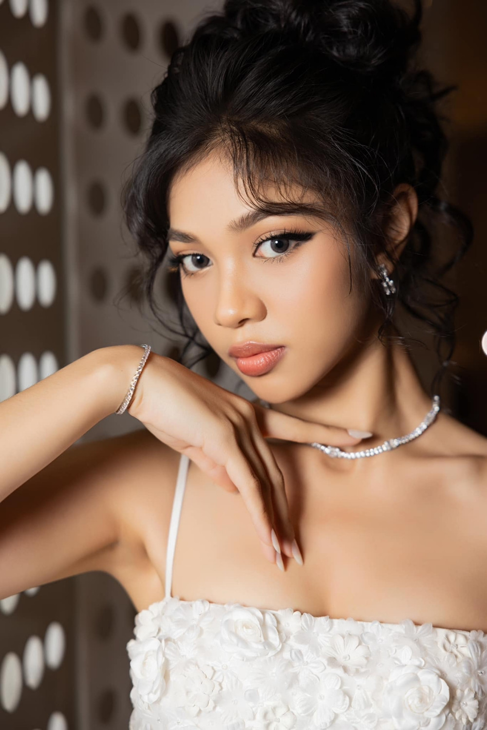 Trước khi cắt ngắn đến ngang lưng, Á hậu Huỳnh Minh Kiên sở hữu suối tóc dài đến gần 1m, chạm đến hông.