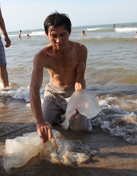 Những con sứa lớn phải đến hai người khiêng. Nhiều con còn tươi được người dân đem về ăn.