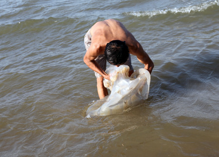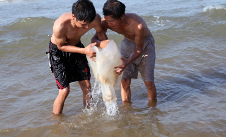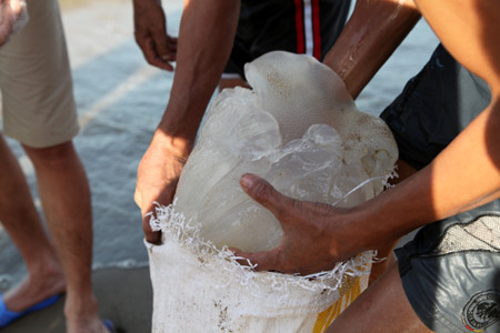 Sứa được ngư dân nhặt bỏ vào bao tải đưa về chế biến thực phẩm.