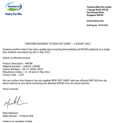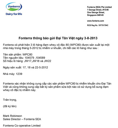 Trước thông tin sản phẩm sữa bị nhiễm khuẩn Clostridium Botulinum do có sử dụng nguyên liệu whey protein concentration từ công ty Fonterra, nhà sản xuất sữa chua Wel Yo đã tiến hành kiểm tra, rà soát hồ sơ xuất xứ các nguồn nguyên liệu đầu vào, và khẳng định không nhập bất kỳ lô hàng sữa bột nào có chứa chất bổ sung đạm whey cô đặc bị nhiễm khuẩn từ Fonterra.