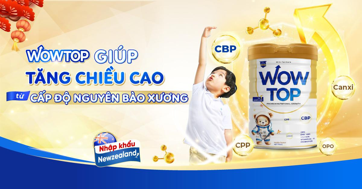 Để mang lại giải pháp toàn diện cho sự phát triển chiều cao của trẻ, dòng sữa cao cấp WOWTOP được nhập khẩu nguyên lon từ New Zealand. Với công thức đặc biệt, tích hợp những thành phần dinh dưỡng vượt trội giúp trẻ phát triển chiều cao từ cấp độ nguyên bào. Điểm nổi bật của Sữa WOWTOP chính là chứa hàm lượng cao CBP (Colostrum Basic Protein) – đạm sữa non chuẩn hóa được chiết xuất từ sữa non quý giá. Với kích thước phân tử siêu nhỏ, CBP kích thích nguyên bào xương hoạt động mạnh mẽ, giúp khung xương dài ra nhanh hơn và chắc khỏe hơn.