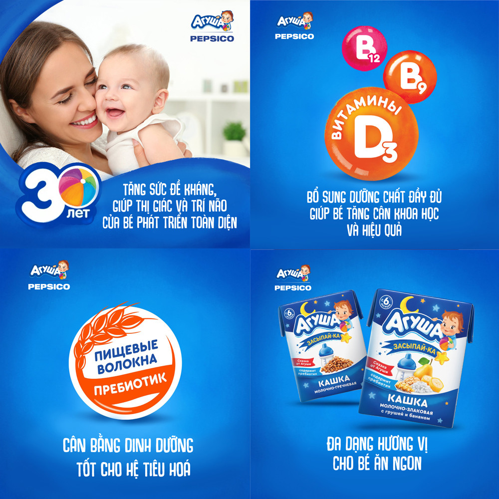 Agusha là dòng sữa ăn dặm nổi tiếng của Nga, là giải pháp dinh dưỡng hoàn hảo cho trẻ nhỏ bị suy dinh dưỡng, chậm lớn và lười ăn từ 6 tháng tuổi trở lên.