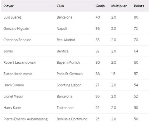 Xếp các vị trí tiếp theo sau Suarez, Higuain và Ronaldo lần lượt là Jonas của Benfica, Robert Lewandowski (Bayern) và Zlatan Ibrahimovic (PSG). Trong khi đó, siêu sao Lionel Messi chỉ cán đích ở vị trí thứ 7 khiêm tốn.