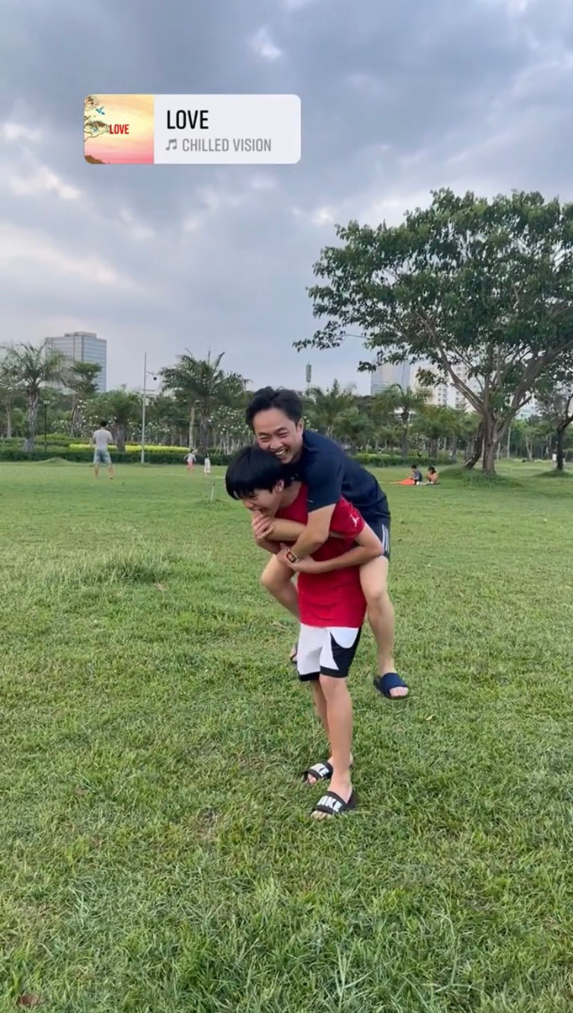 Trước đó Cường Đô La cũng gây chú ý khi chia sẻ video ghi lại khoảnh khắc được con trai cõng trên lưng. Nhóc tì khiến người xem bất ngờ khi cõng bố trên lưng ngon ơ trong đoạn đầu của clip.