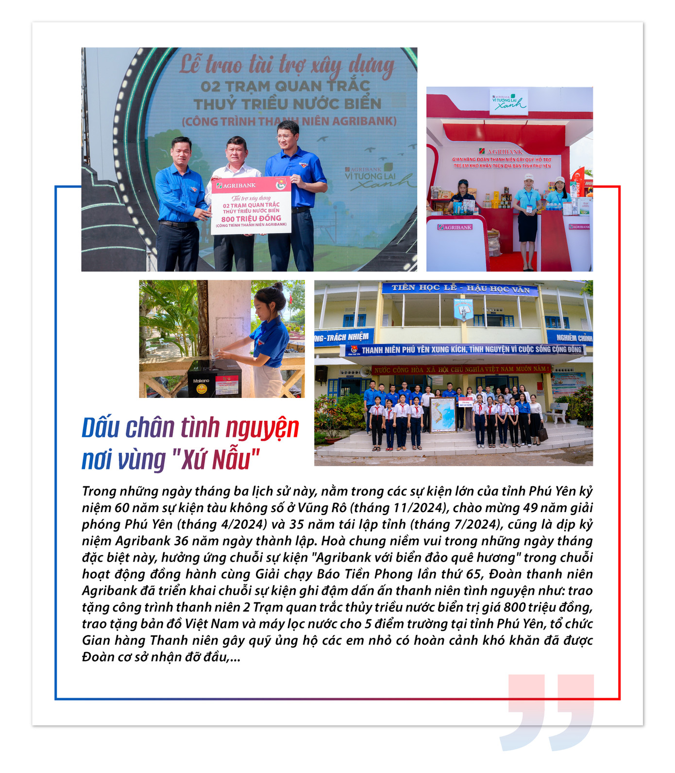 Một dấu ấn tình nguyện đặc biệt trong chuỗi các hoạt động đồng hành cùng Giải Vô địch Quốc gia Marathon và cự ly dài Báo Tiền Phong lần thứ 65 chính là hai công trình thanh niên Trạm quan trắc thủy triều nước biển được Đoàn thanh niên Agribank trao tặng cho Tỉnh Đoàn Phú Yên trị giá 800 triệu đồng. 02 trạm quan trắc này sẽ được lắp đặt bằng cách gắn vào thành cầu Đà Nông thuộc phường Hòa Hiệp Nam, thị xã Đông Hòa, Phú Yên. Việc công trình đi vào sử dụng sẽ giúp các cơ quan làm công tác khí tượng thủy văn có đầy đủ thông tin để đánh giá các đặc trưng thủy triều cũng như các dao động dâng/rút do bão, gió mùa, góp phần đảm bảo an toàn cho các hoạt động trên biển cũng như công tác chỉ đạo phòng tránh và giảm thiểu thiệt hại do thiên tai biển, vùng ven biển hay trên đất liền, và xa hơn là đánh giá xu thế biến đổi khí hậu, thời tiết khí hậu, nước biển dâng.