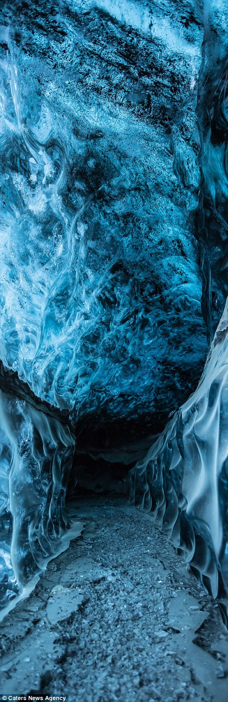 Lớp tro núi lửa gợn sóng kết hợp với những tầng băng làm cho khung cảnh trong hang trở nên vô cùng huyền ảo.