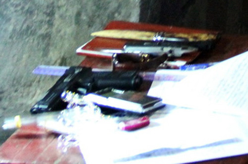 Súng, dao, bình xịt hơi cay trên ôtô được thu giữ. Ảnh: Hoài Thanh