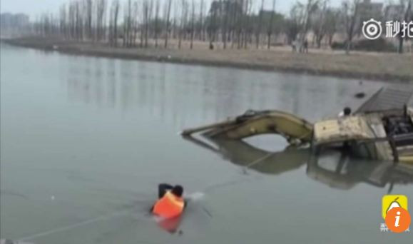 Người công nhân nhanh chân trèo ra, bám vào máy xúc cho đến khi các nhân viên cứu hộ tới giải cứu.
