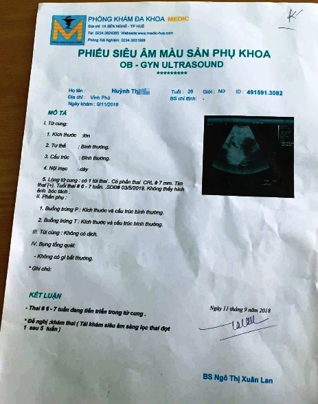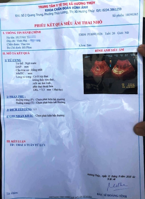 Ngày 12/9, PV tiếp nhận thông tin phản ánh từ bạn đọc liên quan việc một sản phụ tên là Huỳnh Thị N. (ngụ xã Vinh Phú, huyện Phú Vang, tỉnh TT-Huế) khi đến khám thai tại Trung tâm Y tế thị xã Hương Thủy (phường Thủy Lương, Hương Thủy, TT-Huế) được chẩn đoán “thai 6 tuần tử lưu”, dẫn đến suýt phải phá bỏ thai nhi để bảo toàn sức khỏe, tính mạng thai phụ.
