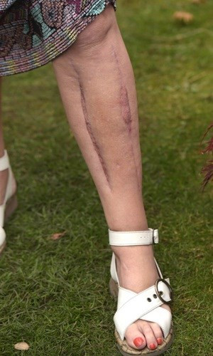Chỉ vì tiếc chiếc quần jeans chật và muốn mảnh mai mà cô suýt đối mặt với tử thần. Sau ca phẫu thuật, chân cô Jane có những vết sẹo dài nhưng cô vẫn thầm cảm ơn trời vì mình sống sót. Ảnh: The Sun.