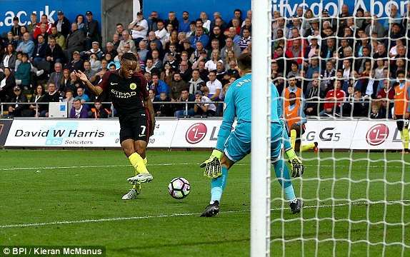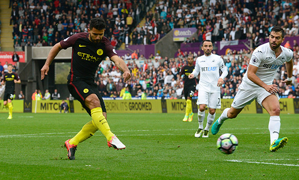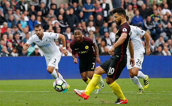 Sau 3 trận bị treo giò, Sergio Aguero trở lại đội hình xuất phát và ngay lập tức ghi bàn. Phút thứ 9, Aguero tung cú sút quyết đoán từ góc hẹp, mở tỷ số cho Man City. Đây là lần đầu tiên trong sự nghiệp, Aguero ghi bàn trên sân Liberty của Swansea.