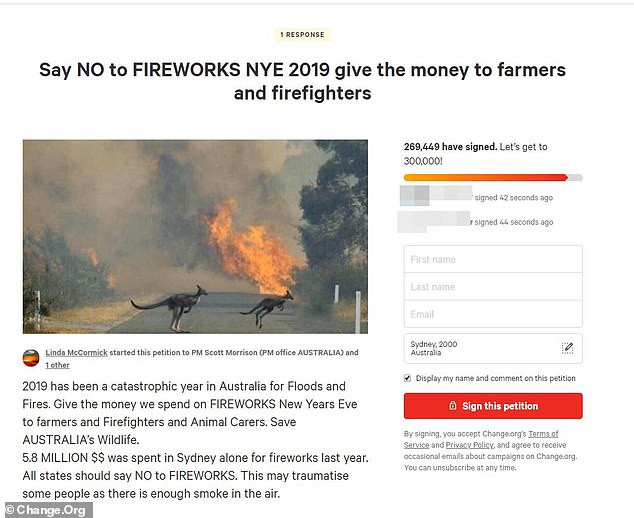 270.000 người cũng đã kí đơn kiến nghị huỷ bỏ chương trình bắn pháo hoa chào năm mới nổi tiếng của thành phố Sydney để dồn tiền cho chiến dịch chữa cháy rừng.