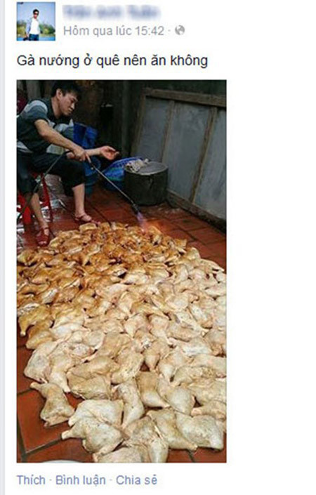Anh Tuấn cho biết, bức ảnh trên anh chụp bằng điện thoại vào trưa 6/4, khi đi ăn cưới nhà họ hàng ở Cổ Loa (Đông Anh, Hà Nội). Anh đăng trên trang cá nhân vào khoảng 15h chiều cùng ngày với lời tựa “Gà nướng ở quê nên ăn không”.
