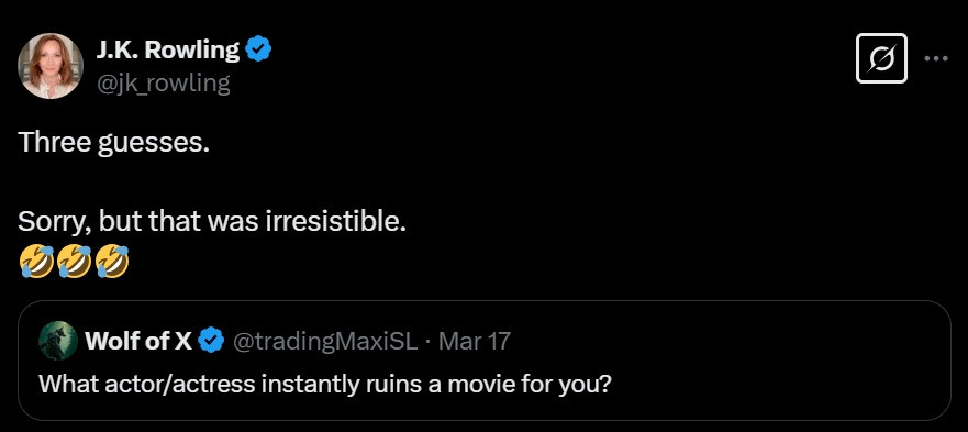 Gần đây, tác giả J.K. Rowling đã trả lời một câu hỏi trên X (Twitter trước đây). Cụ thể, một bài đăng hỏi rằng “Theo bạn, diễn viên nam/nữ nào khiến bạn ngay lập tức cảm thấy sẽ phá hỏng bộ phim?”. J.K. Rowling đã đưa ra câu trả lời đầy ẩn ý: “Cho ba lần đoán đó. Xin lỗi nha, nhưng tôi không kìm được”. Tác giả Harry Potter kết thúc câu trả lời với ba biểu tượng cười chảy nước mắt.