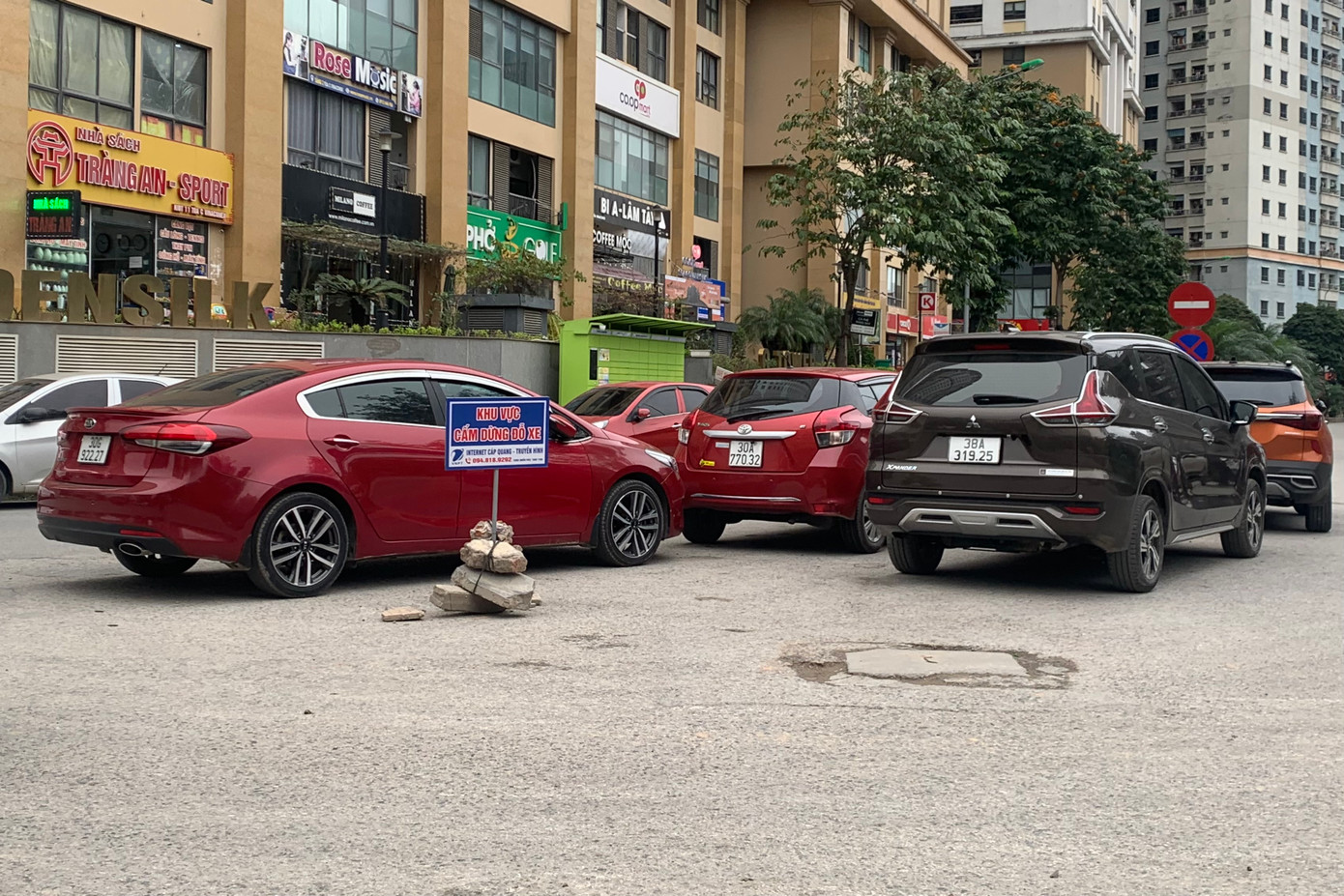 | Biển cấm dừng đỗ được đặt khắp chỗ trong khu đô thị Kim Văn - Kim Lũ. |