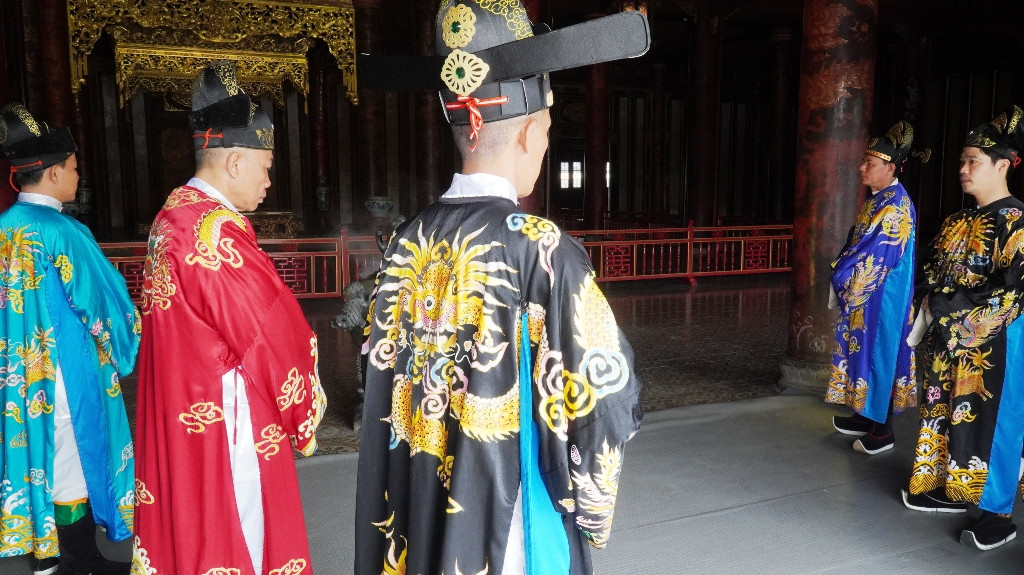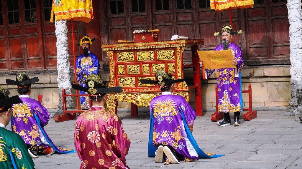 Sáng 2/2, tại điện Thái Hòa - Đại nội Huế, Trung tâm Bảo tồn Di tích (BTDT) Cố đô Huế tổ chức tái hiện sân khấu hóa lễ Nguyên đán trong Hoàng cung triều Nguyễn xưa.