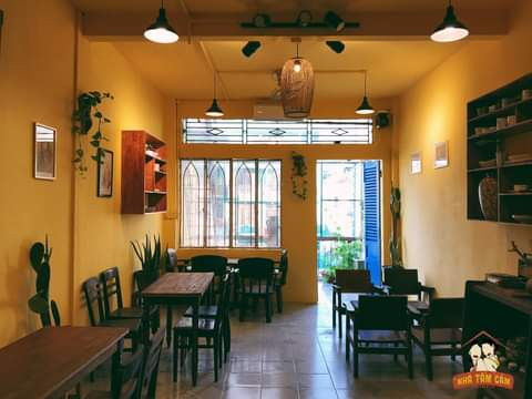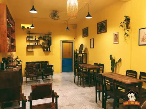 Bước chân vào Gốm Nhà Tấm Cám, bạn sẽ có cảm giác được “ấp ôm” bằng màu vàng đậm của những bức tường xung quanh. Những cánh cửa sổ sơn xanh dương như trở thành điểm nhấn độc đáo trên nền vàng ấy. Không gian bên trong nhỏ nhắn và được décor theo phong cách vintage.