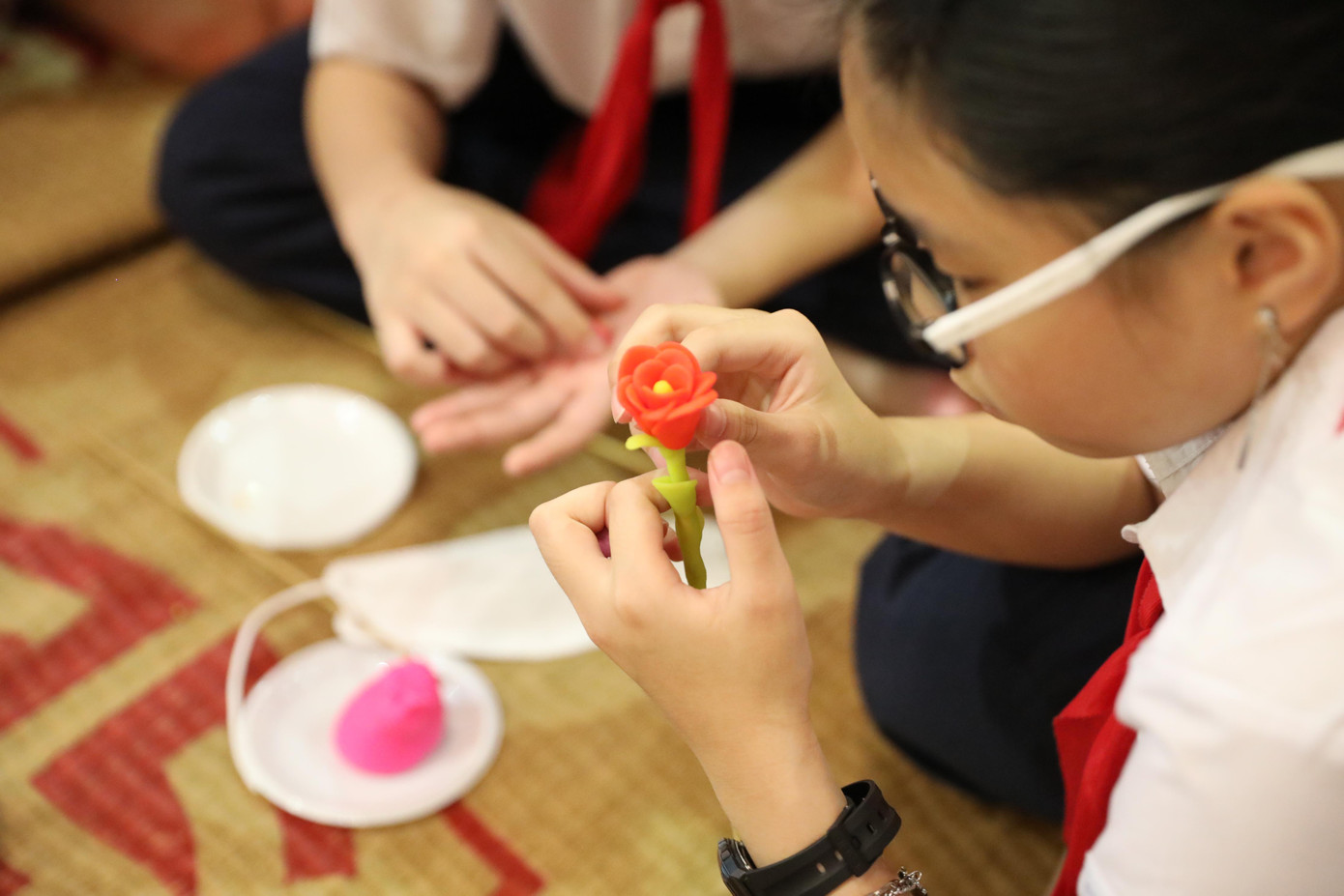 | Các em học sinh chăm chú xem hướng dẫn cách làm đèn ông sao |