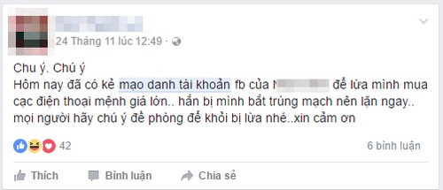 Thu Hằng (Đại học Y Dược Huế, thành phố Huế) cho biết cô vừa phát hiện một tài khoản giả mạo với hình ảnh đại diện, ảnh bìa, thông tin cá nhân… giống y hệt tài khoản cô đang sử dụng. "Bạn bè hỏi vì sao tôi lại lập tài khoản mới và yêu cầu kết bạn, khi đó tôi mới tá hỏa là có người mạo danh. Lập tức, tôi đăng trạng thái cảnh báo bạn bè không nên chấp nhận lời kết bạn của tài khoản này", cô cho hay.