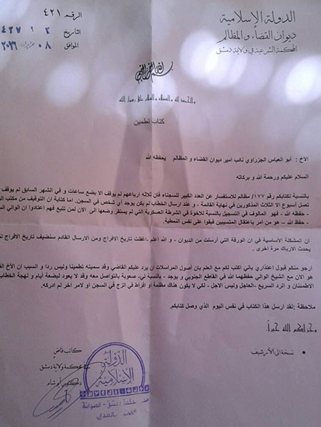 Bức thư kết tội al-Ghoutani là "murtad (kẻ bội giáo) bởi vì hắn "tập hợp mọi thủ lĩnh quân sự IS bên trong khu vực với cớ là bàn luận về chiến dịch quân sự và an ninh chống lại al-Sahawat, song thực ra là hắn bí mật câu kết với al-Sahawat để âm mưu ám sát mọi thủ lĩnh bằng chất nổ hay mìn gài sẵn tại địa điểm họp".