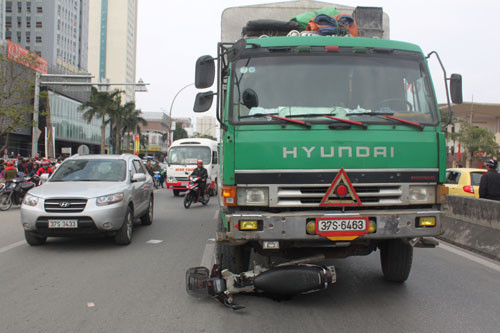 Tai nạn làm bà Yến chết tại chỗ, người ngồi phía sau bị thương. Tại hiện trường, xe máy của nạn nhân vỡ nát, kẹt dưới bánh trước xe tải.