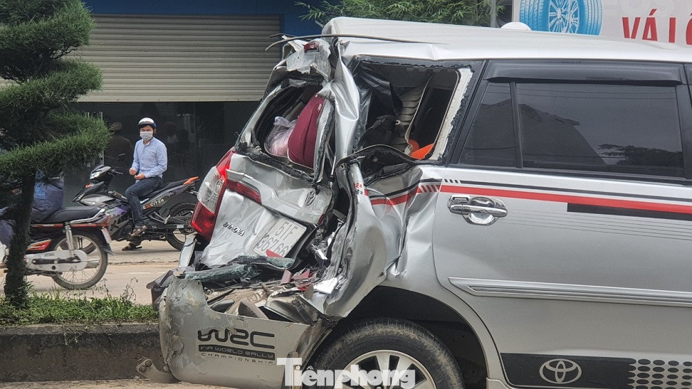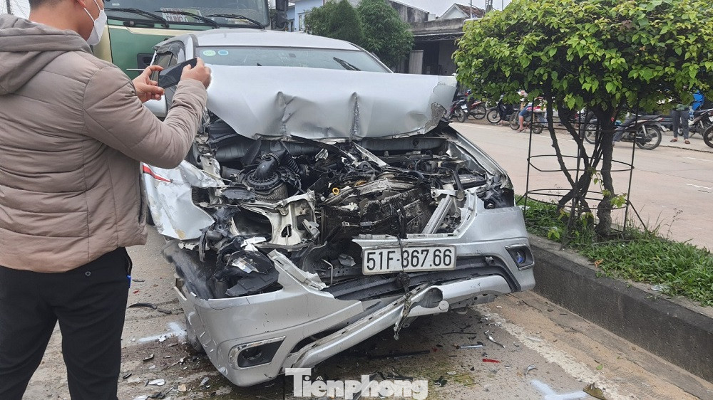 Các xe tải còn lại nằm dính chùm vào nhau. Riêng xe ô tô 7 chỗ mang BKS 51F-367.66 bị hư hỏng toàn bộ phần đầu và đuôi xe. Những người bên trong xe ô tô con bị thương được người dân đưa đi cấp cứu.