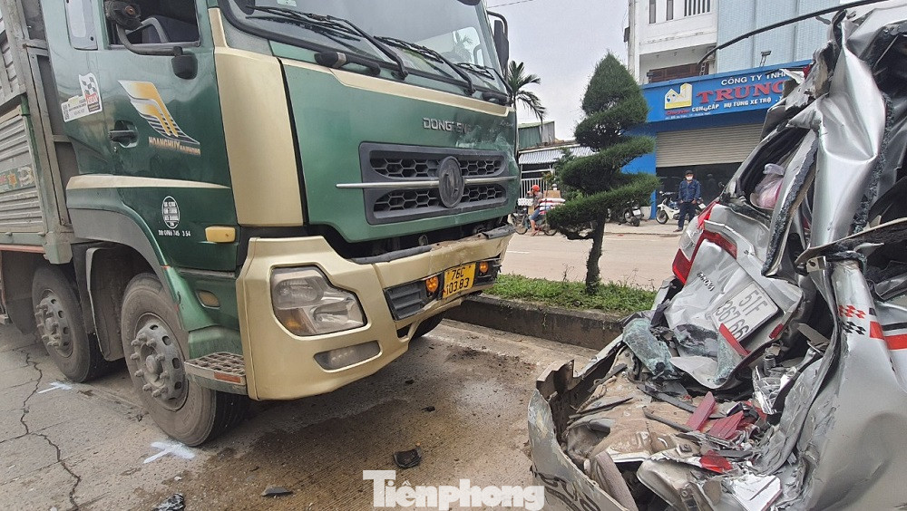 Theo đó, vào khoảng 10 giờ 30 phút ngày 30/1, tại nút giao thông giữa Quốc lộ 1A với đường Lê Trung Đình (đoạn qua phường Nghĩa Chánh, TP Quảng Ngãi), khi các phương tiện đang dừng đèn đỏ thì xe tải chở dăm gỗ mang BKS 76C-103.83 bất ngờ từ phía sau tông thẳng vào đuôi xe ô tô 7 chỗ mang BKS 51F-367.66 khiến ô tô 7 chỗ lọt thẳng vào gầm xe tải mang BKS 76H-011.23 phía trước.