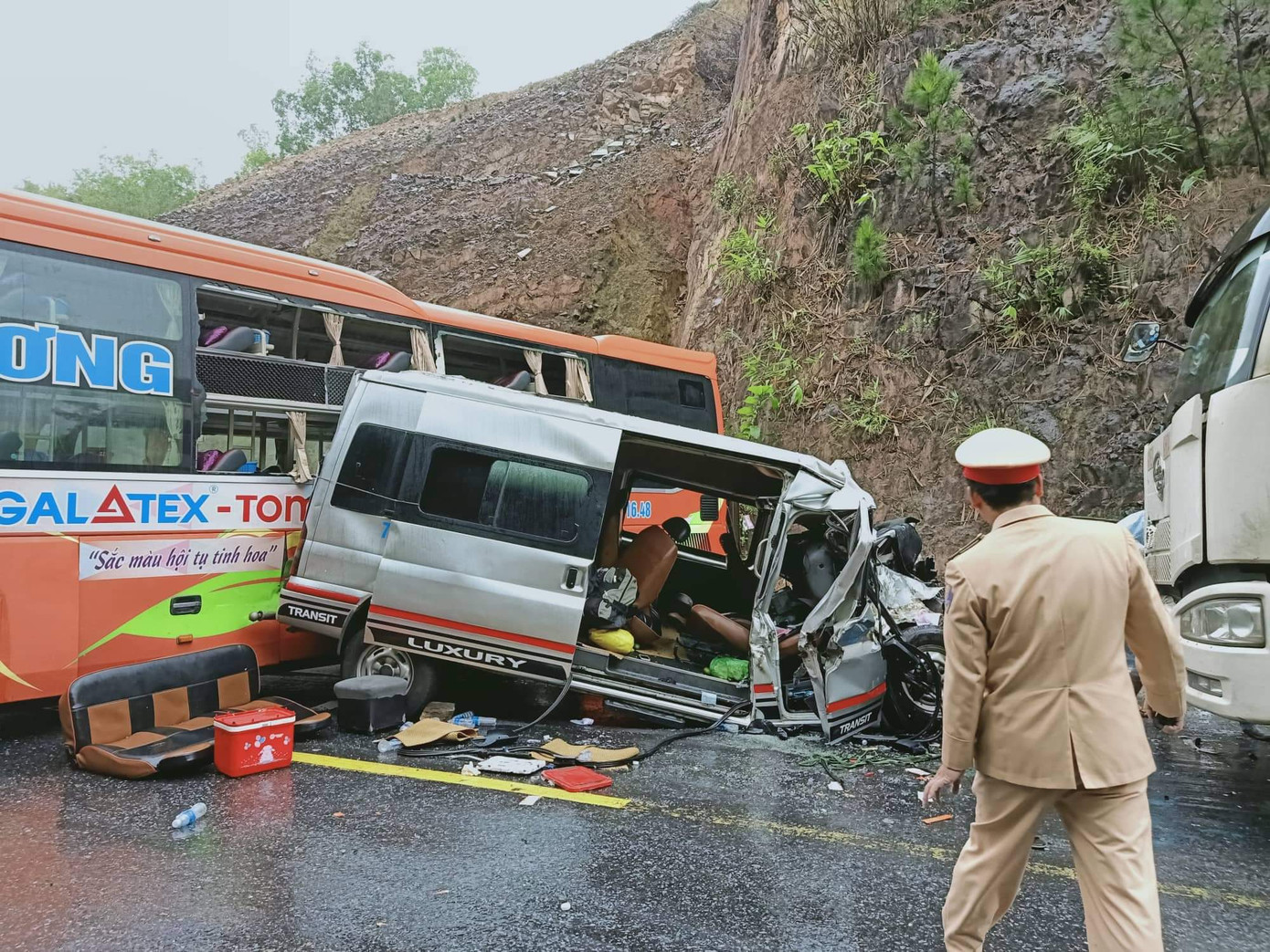 Tại hiện trường, chiếc xe 16 chỗ nằm kẹt giữa hai xe tải và xe giường nằm, đầu 26 chỗ xe bị bẹp rúm. Nhiều hành lý của khách, ghế xe văng ra nằm vương vãi giữa lòng đường quốc lộ.