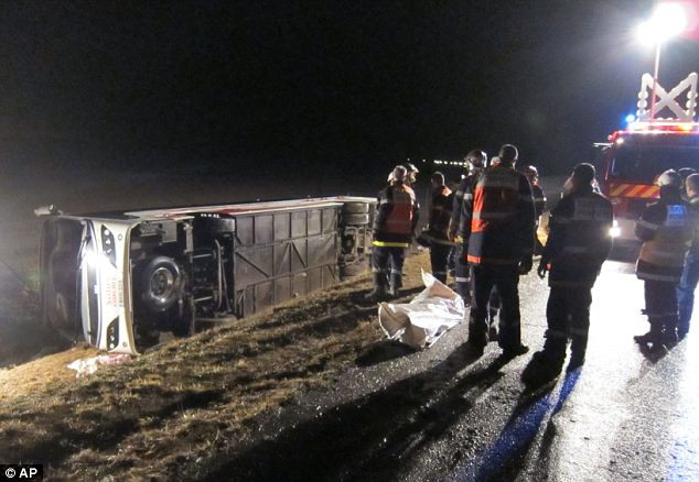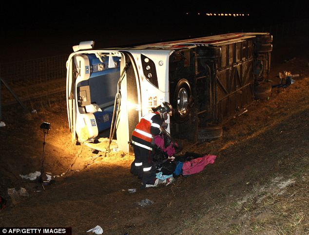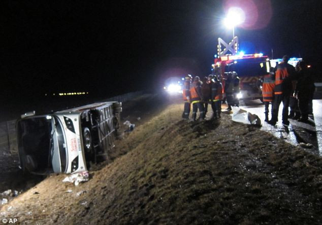 | Hiện trường vụ tai nạn. Chiếc xe buýt bị lật ngay trên đường cao tốc A26, tại Chalons-en-Champagne tại Pháp. |