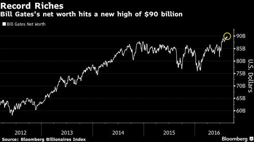 Nguyên nhân là các cổ phiếu ông nắm giữ tăng giá, trong đó có Công ty Đường sắt Quốc gia Canada và hãng công nghệ năng lượng Ecolab. Số tài sản mà Bill Gates sở hữu tính đến hết tuần vừa rồi đã tương đương 0,5% GDP Mỹ.