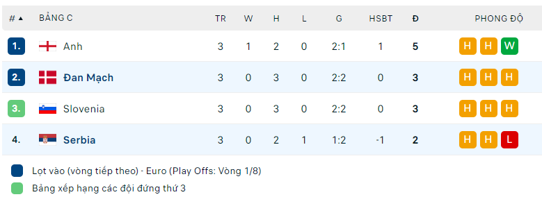 Đây là bảng đấu “đặc biệt” ở EURO 2024 khi 5 trong tổng số 6 trận đấu diễn ra kết thúc với tỷ số hòa. Trận duy nhất phân thắng bại là màn so tài giữa Anh và Serbia ở lượt trận đầu tiên, khi Tam Sư đánh bại đối thủ 1-0 nhờ bàn thắng duy nhất của Jude Bellingham.