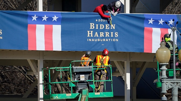 Cờ trang trí chuẩn bị cho Lễ Nhậm Chức của ông Joe Biden và bà Kamala Harris đang được căng ở gần Nhà Trắng. Ảnh: Getty Images.