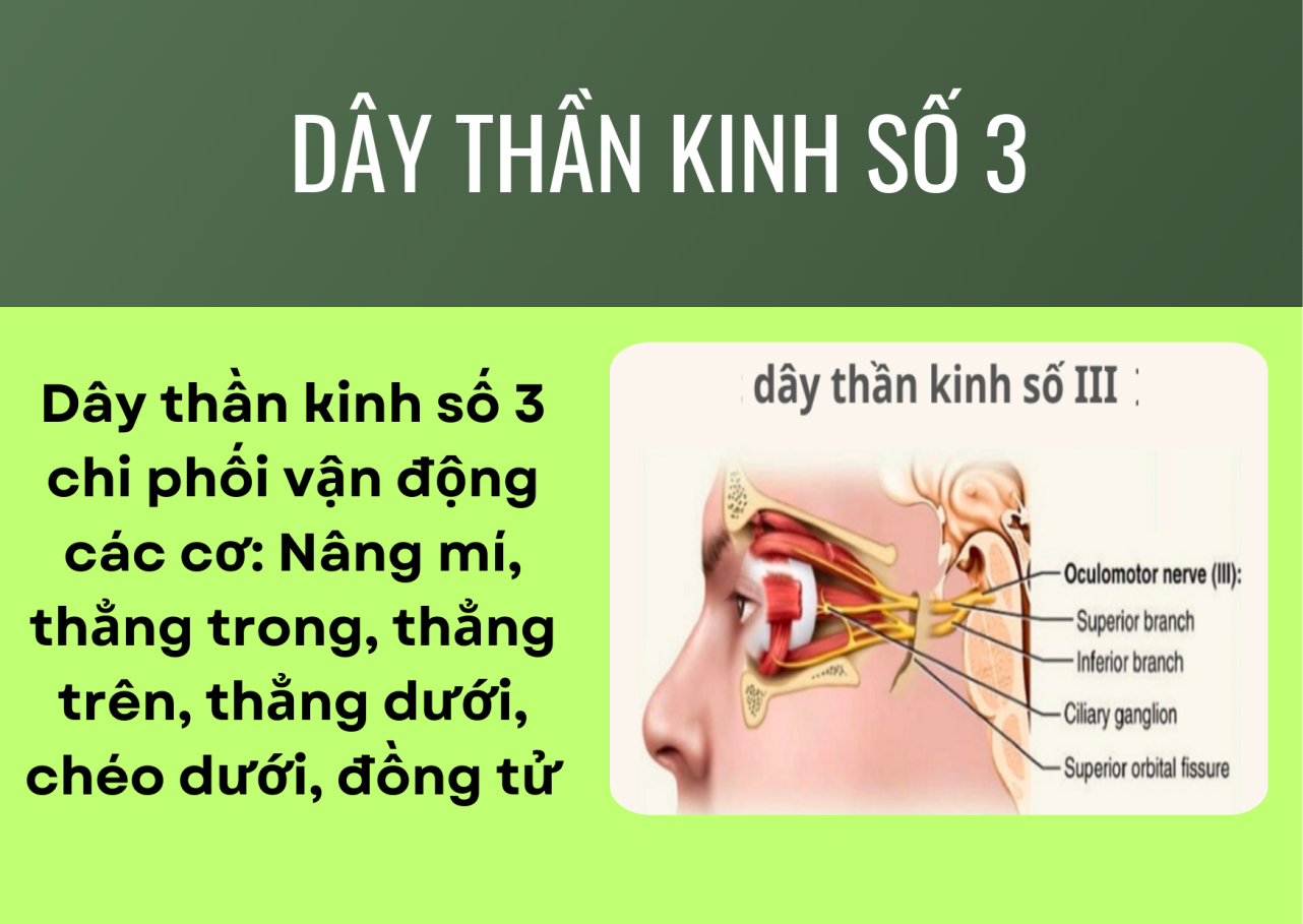 Dây thần kinh số 3 là một trong 12 dây thần kinh sọ của con người và chúng đảm nhận chức năng: vận động một số cơ mắt, giúp đưa nhãn cầu vào trong, lên xuống để tạo ra cử động mắt, mở mí mắt và chức năng đồng tử.. Khi bị ảnh hưởng bởi dây thần kinh số 3 có thể gây nên tình trạng mắt lác (mắt lác ra ngoài hoặc lác xuống dưới), sụp mi, đồng tử bị giãn hoặc có thể làm liệt vận nhãn.