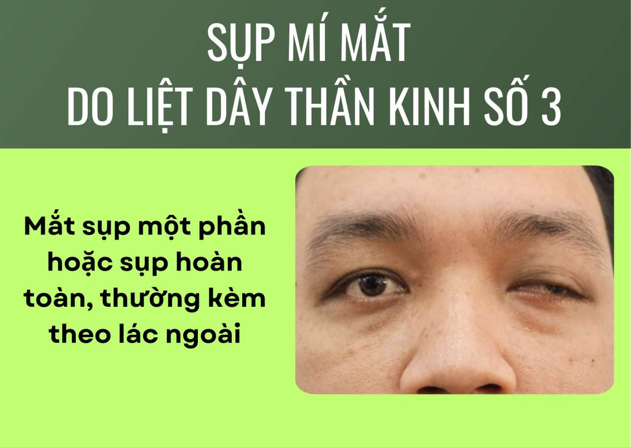 Như chúng ta đã biết, dây thần kinh số 3 chịu trách nhiệm điều khiển cơ nâng mí giúp mắt mới mở được. Do đó, khi những bệnh lý như: khối u, tai biến mạch máu não, chấn thương... hoặc do nguyên nhân nào đó gây liệt dây thần kinh số 3 thì mí mắt bị sụp.