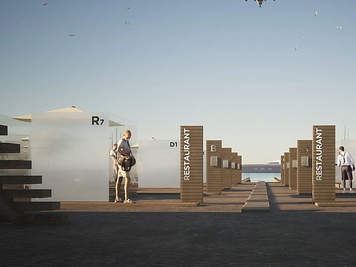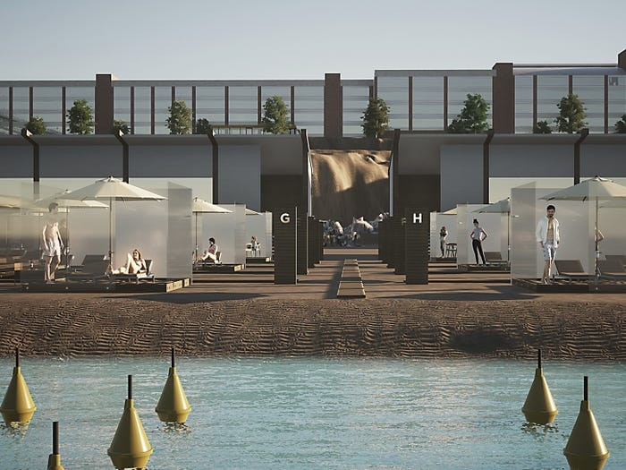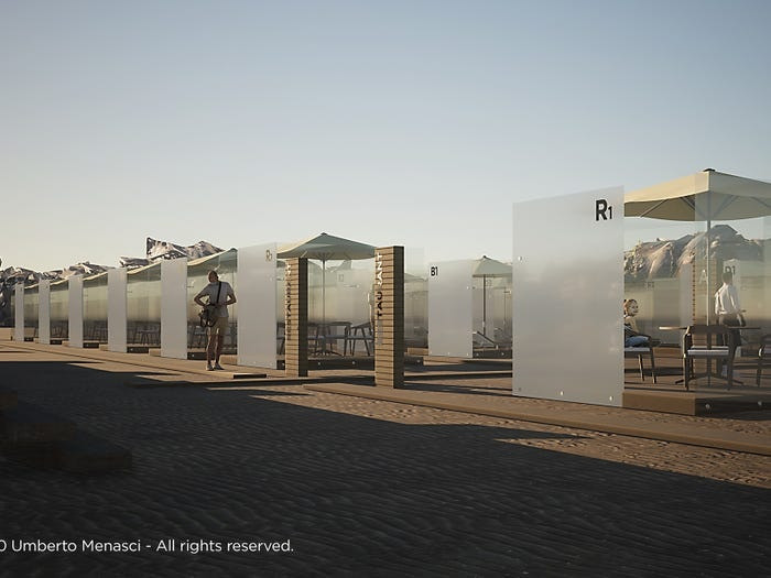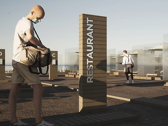 “SafeBeach” là ý tưởng bãi biển và khách sạn thú vị có thể giúp việc mở cửa trở lại các bãi biển được an toàn hơn. Một khu vực lễ tân "giãn cách" được xây dựng để hỗ trợ đặt chỗ. Bằng cách này khách tới tắm biển thậm chí không phải xếp hàng. (Ảnh: BI)