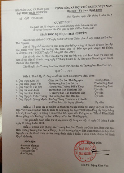GS.TS Đặng Kim Vui, Giám đốc ĐH Thái Nguyên, vừa kí quyết định thành lập Tổ công tác xác minh nội dung báo chí phản ánh liên quan đến việc PGS.TS Đàm Khải Hoàn phát ngôn “có thể lấy được bằng Tiến sĩ Y khoa với giá 200 triệu đồng”.