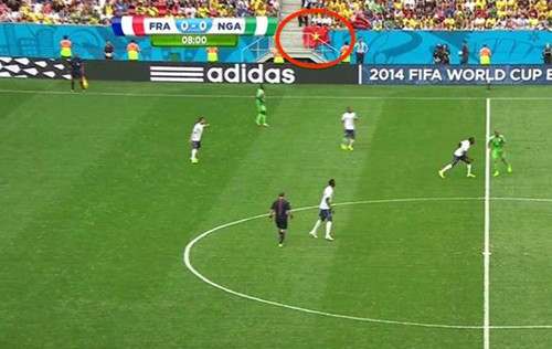 Theo dõi trận đấu giữa Pháp và Nigeria ở vòng 16 đội hôm qua 30/6, người hâm mộ Việt Nam không khỏi ngỡ ngàng khi thấy lá cờ đỏ sao vàng tung bay trên sân Mane Garrincha. Người mang quốc kỳ Việt Nam tới ngày hội bóng đá lớn nhất hành tinh là bố con anh Trần Khang Ninh, quê Nam Định.