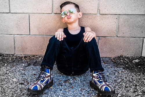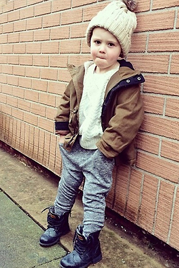 Nét bụi bặm của chiếc mũ len cùng giày da cao cổ giúp bộ trang phục của cậu bé thêm phần cuốn hút.