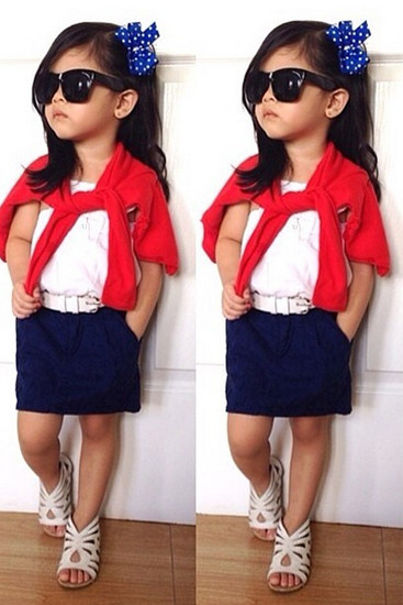 Chiếc áo đỏ buộc trên vai tạo nên sự phá cách cho bộ trang phục của nhóc tì.