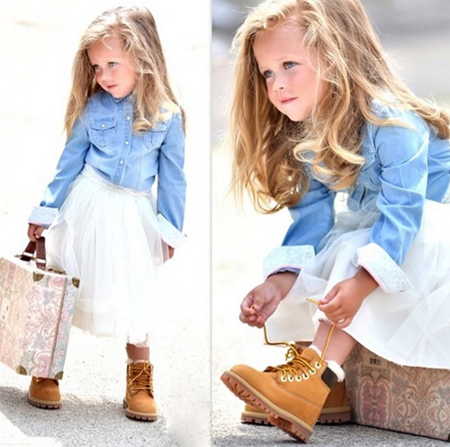 "Thiên thần" nhí phối chân váy xòe với áo jean cá tính. Đôi giày cổ cao màu camel giúp bé gái thêm nổi bật trên phố.