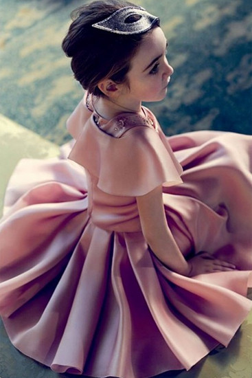 Cô bé điệu đà và sang trọng với váy lụa dáng xòe cùng mặt nạ đeo trên đầu.